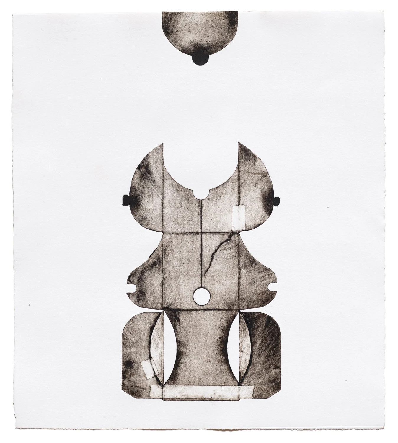 KM: The source material for the intaglio prints are all kinds of unfolded, thin cardboard boxes; Kleenex boxes, rubber gloves, cosmetics, 6-pack of beer, electronics.My interest in them originated during the COVID period of the outside world often coming to us via the mail. But for years I had noticed that unfolded boxes often look like figures or effigies. The shapes have a sort of ancient future aesthetic.