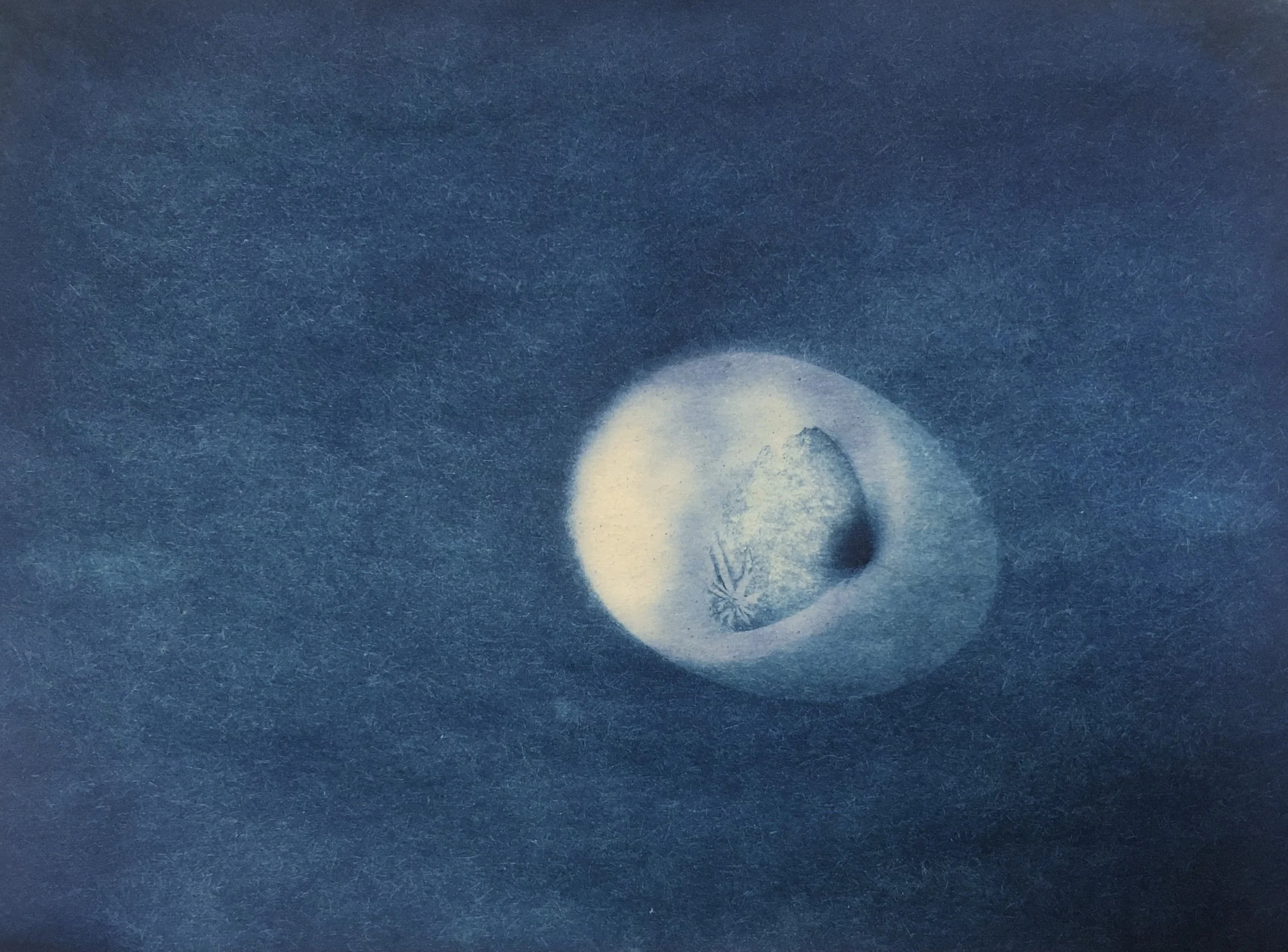Known for her largely collaborative and relational practice exploring intimacy and sexuality through physical, linguistic and relational interventions and documentations, Sun, Moon, Egg considers relationality on a more internal level. The cyanotypes evoke both celestial forms, which have historically been perceived as intertwined with the reproductive cycle, and an imagined interiority of the body.